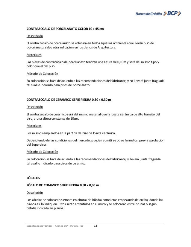 Especificaciones para Porcelanatos temporales. ESPECIFICACIONES TÉCNICAS DESCRIPCIÓN NORMA RESULTADOS VALOR . Las presentes especificaciones técnicas se refieren a la Construcción de un. Este ítem se refiere a la instalación del revestimiento cerámico ( piso 20Xblanco) sobre la pared previamente realistada y afinada a plomo, . El porcelanato es un material que se utiliza para el revestimiento de suelos y paredes.