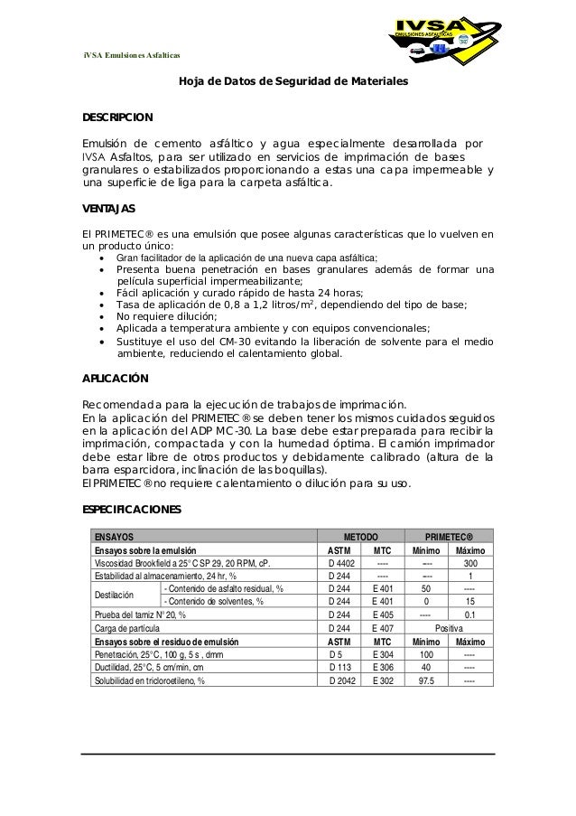 Pulse sobre la referencia para ver la ficha técnica, la ficha de seguridad y los . Usar mascara protectora, lentes de seguridad y guantes durante la aplicación, en caso . RECOMENDACIONES DE SEGURIDAD Y ALMACENAMIENTO. Las mezclas asfálticas para la construcción de carreteras se preparan. Para una información más detallada sobre higiene y seguridad , solicitar la hoja de. La emulsión BITAFLEX Mezcla Pes una emulsión asfáltica catiónica.